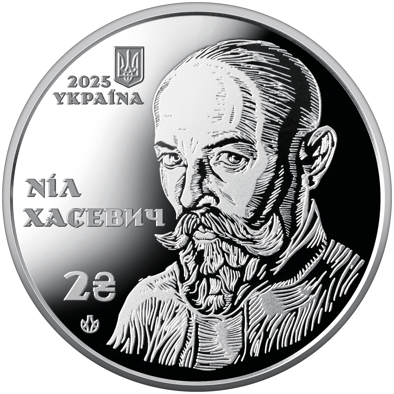 На аверсі монети в центрі композиції розміщено автопортрет Ніла Хасевича, виконаний у характерній для митця техніці деревориту, що вирізняється експресивною графікою, контрастною лінійністю та динамічним штрихуванням. Ліворуч на дзеркальному тлі зображено: малий Державний Герб України, рік карбування 2025, напис УКРАЇНА (вгорі); напис НІЛ / ХАСЕВИЧ (по центру); номінал 2 з графічним знаком гривні та логотип Банкнотно-монетного двору Національного банку України (унизу).