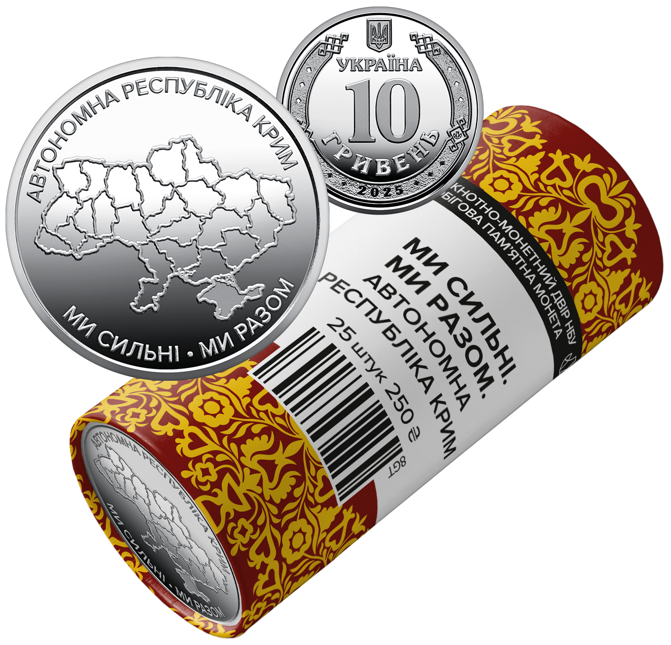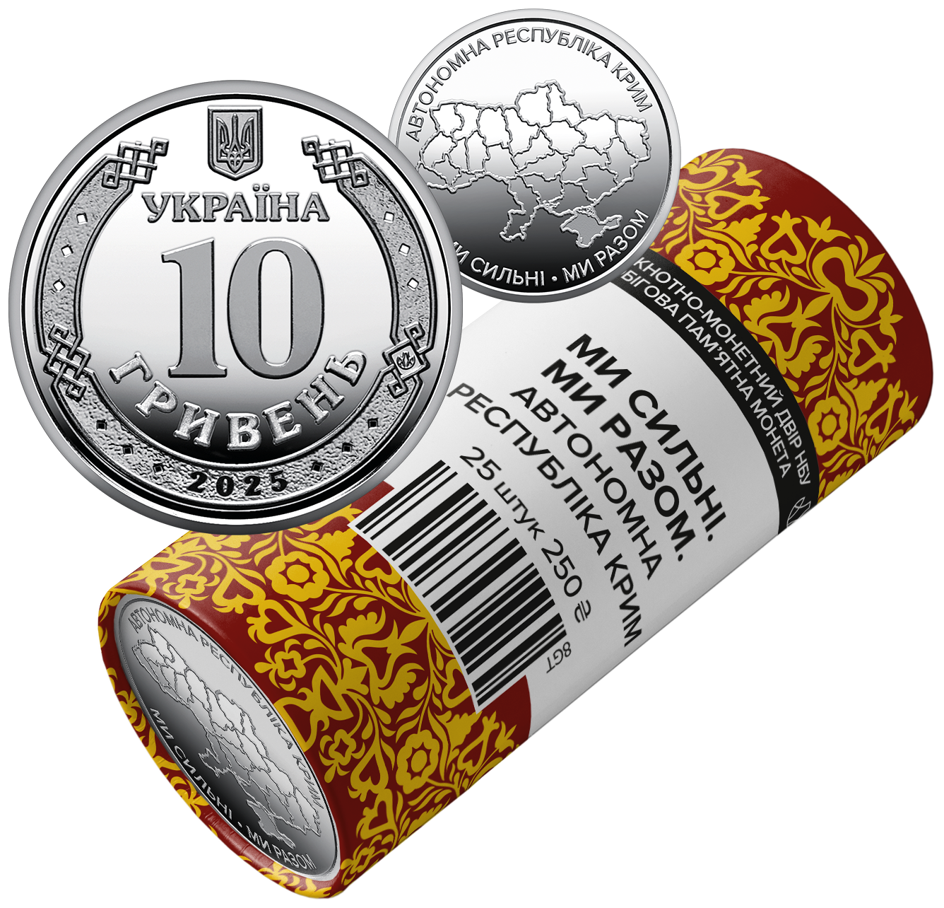На сувенірному папері, у який запаковано кожний ролик, розміщено написи: БАНКНОТНО-МОНЕТНИЙ ДВІР НБУ, ОБІГОВА ПАМ’ЯТНА МОНЕТА, Ми сильні. Ми разом. Автономна Республіка Крим, 25 ШТУК, номінал 250 та графічний знак гривні; логотип Банкнотно-монетного двору Національного банку України, кримсько-татарський орнамент.