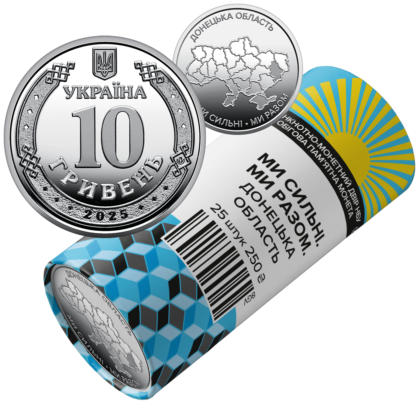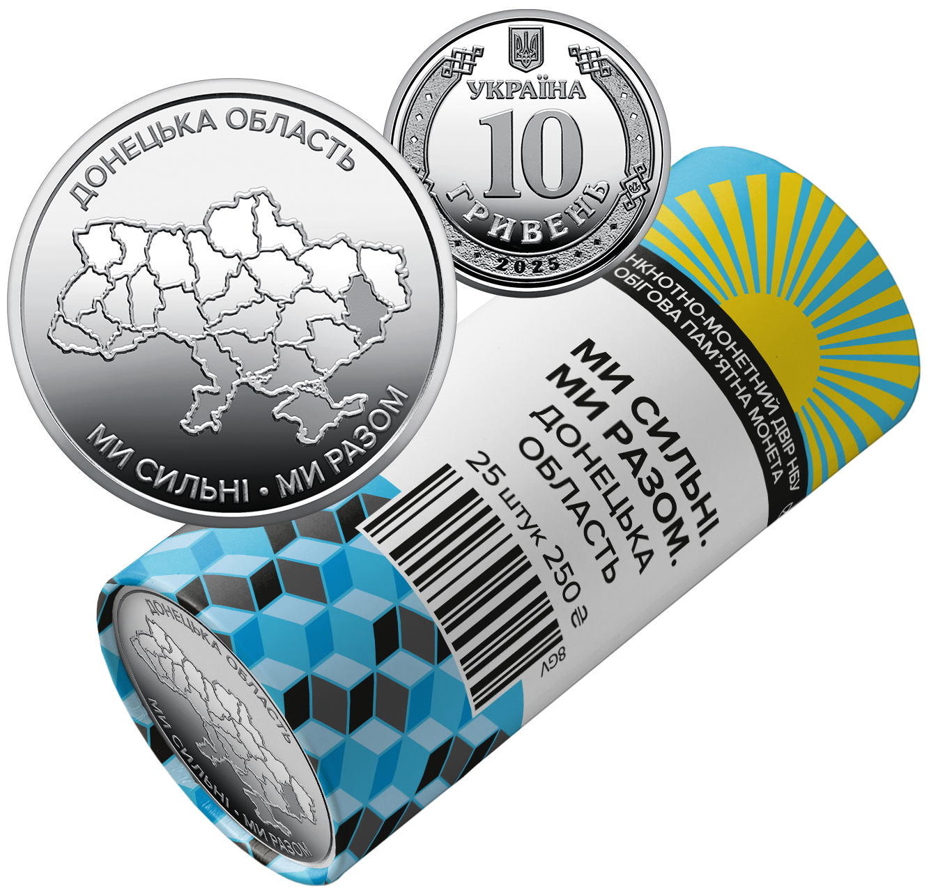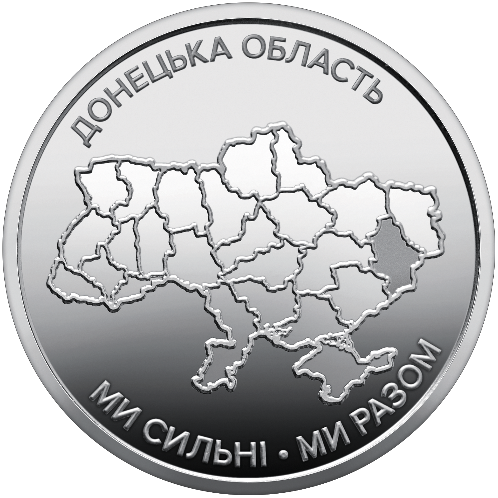 Обігова пам’ятна монета “Ми сильні. Ми разом. Донецька область” (далі – монета), присвячену невід’ємній частині України, визначеній Конституцією України, – Донецькій області. Її територіальна належність до України підтверджена міжнародним правом і визнана світовою спільнотою.